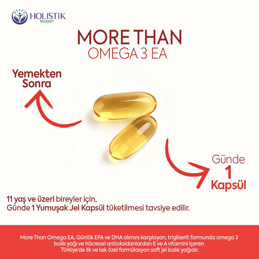 More Than Omega EA, Günlük EPA ve DHA alımını karşılayan, trigliserit formunda omega 3 balık yağı ve hücresel antioksidanlardan E ve A vitamini içeren Türkiye’de ilk ve tek özel formülasyon soft jel balık yağıdır.